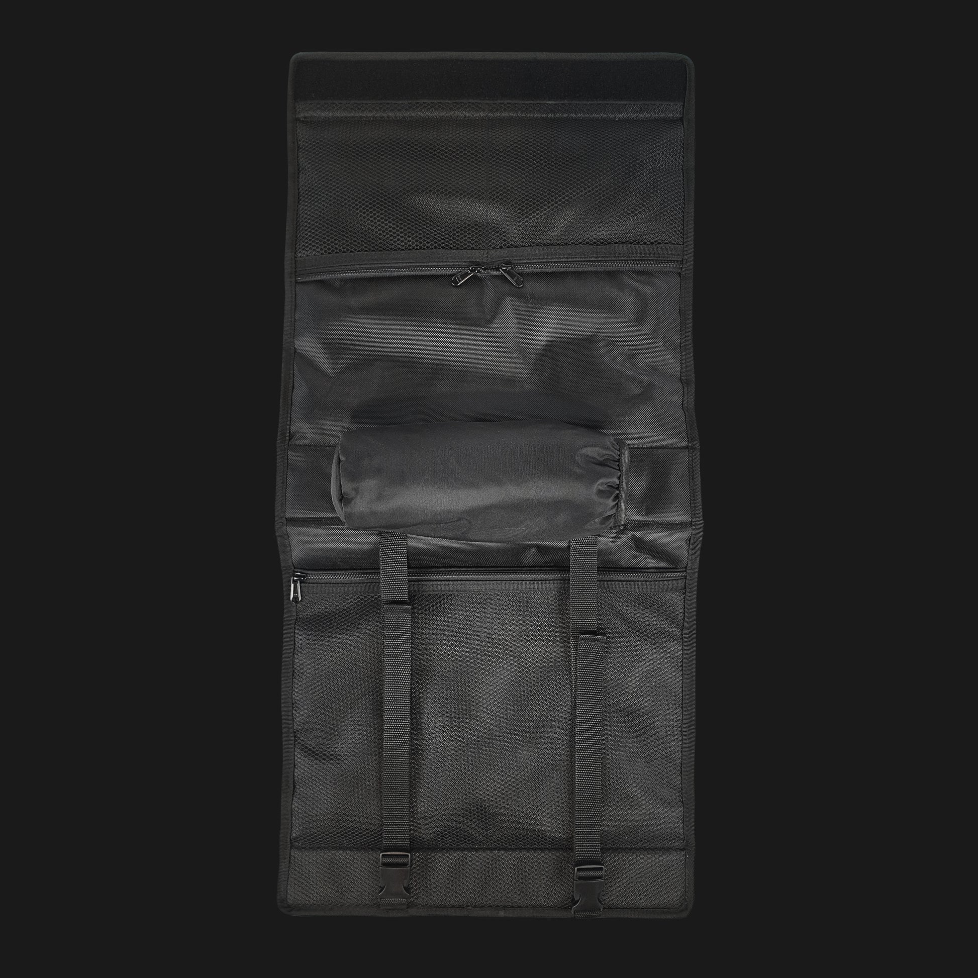 - Roll-top opening with buckle secures all items